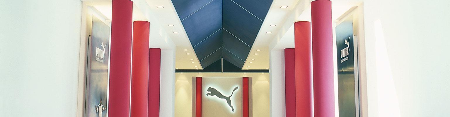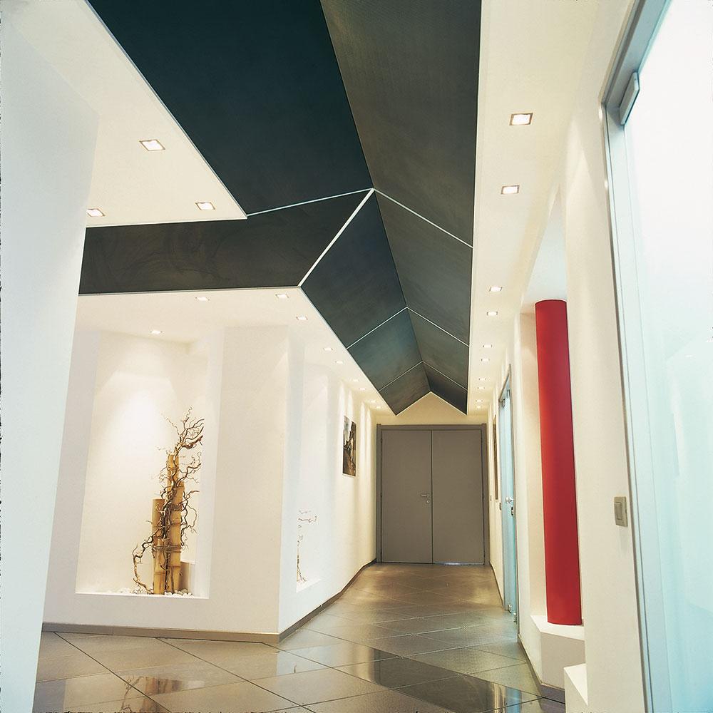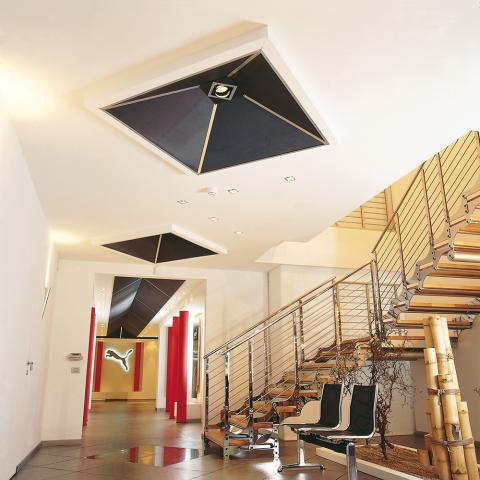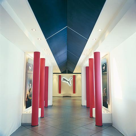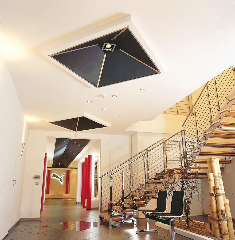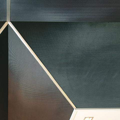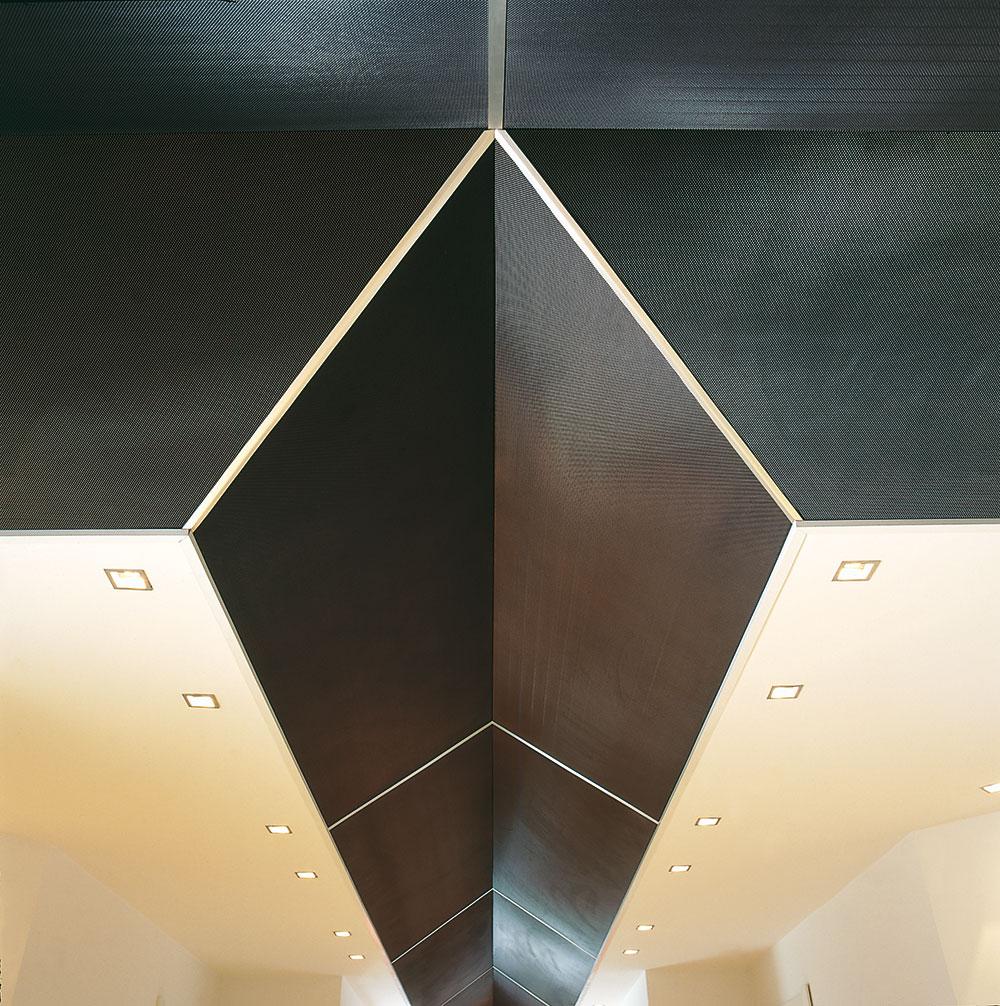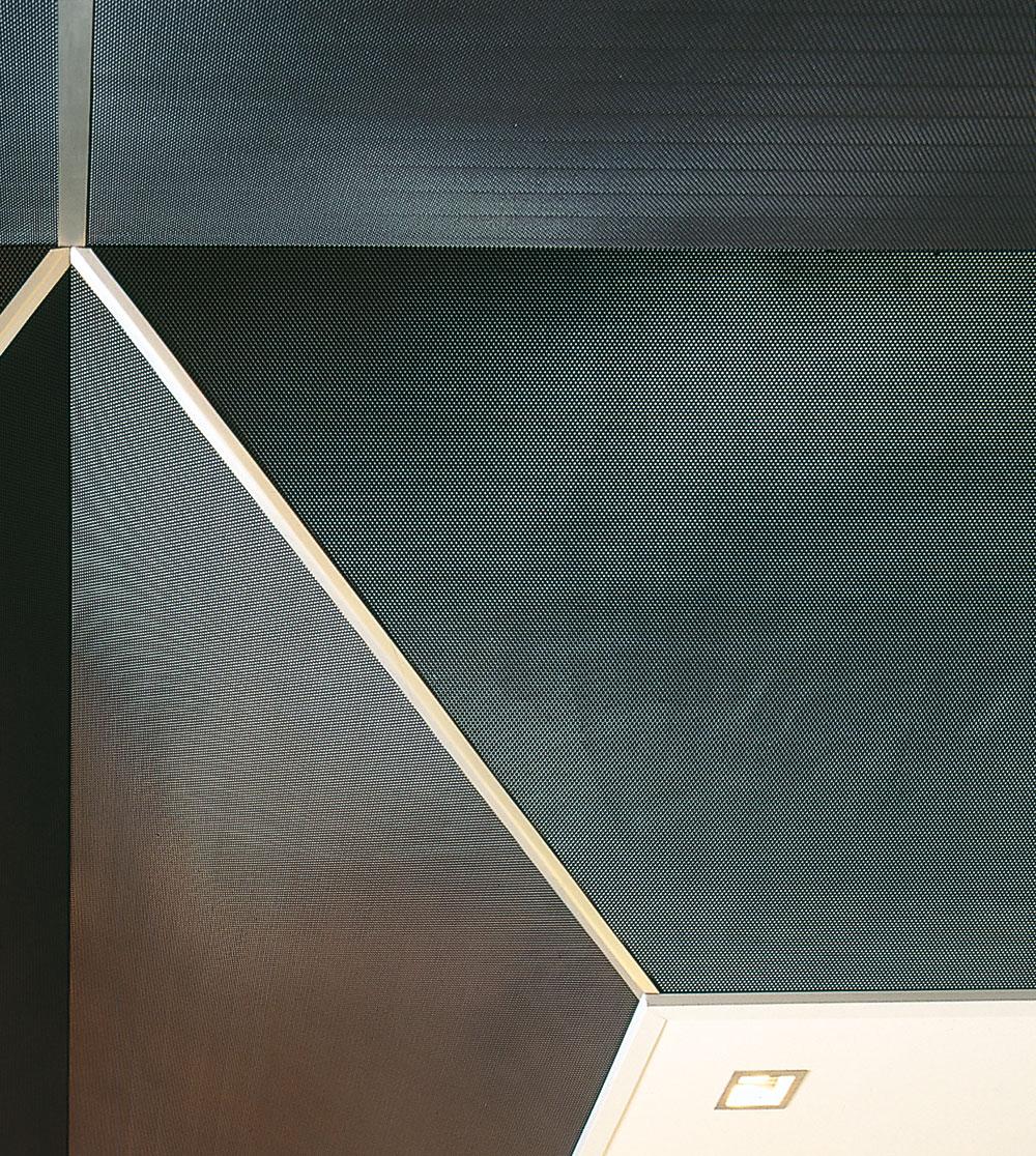 Efecto cromático fascinante con el color negro del falso techo en malla de metal estirado en contraste con el color rojo de las columnas. Formas gráficas de los paneles negros que decoran el techo.